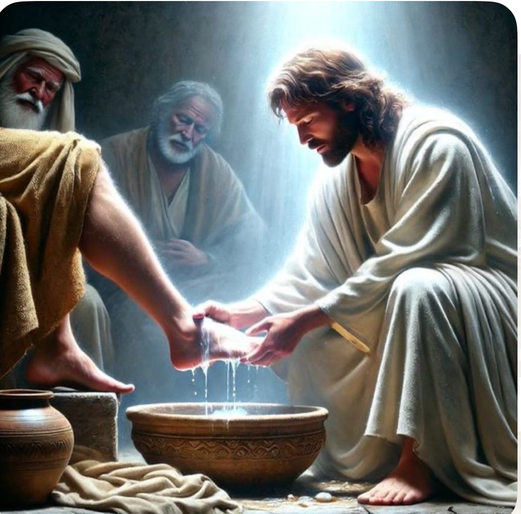 晚餐的時候,主耶穌知道自己即將離開門徒,他要告訴門徒將會遇到的情況。在進餐時,耶穌突然站起來,拿水倒在盆子裏,把手巾束在腰上,為門徒遂一洗腳,並用手巾幫他們擦乾。彼得反對說:「主啊!你不可以洗我的腳!」耶穌回答說:「我不洗你的脚,我就與你沒有關係了。彼得聽見嚇得不知所措說:「主啊,洗!洗!洗,請洗我的腳、洗我的手、連頭也替我洗!」彼得知道如果不給耶穌洗腳,後果非常嚴重,有可能與主耶穌關係斷絕!耶穌為門徒洗完腳後說:「我是你們的主,你們的拉比(老師),我給你們作的榜樣,日後你們也要照著我向你們所作的去做。」