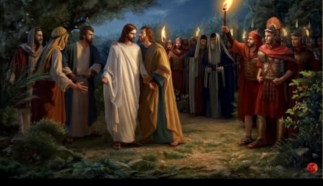 猶大事前與捉拿耶穌的人有暗號:「你們看我向誰親嘴,那人就是耶穌,你們要趕快捉住他。」猶大走上前向耶穌說:「拉比,向你請安!」然後向主耶穌親嘴。」兵丁看見了暗號,便立刻上前捉拿耶穌,彼得看見這情況,就拿出刀來,削下大祭司的僕人一邊的耳朵,主耶穌即時制止說:「收刀入鞘吧! 凡是動刀的一定死在刀下。」主耶穌伸手摸一摸僕人的耳朵醫治了他。主耶穌說:「你想一想,我是可以求我父現在派12營多的天使來求我(【營】字為當時羅馬的軍事用詞,一營士兵人數從三千到六千不等,(十二營天使)即是很多天使),但若是我這樣做,先知所說的預言,要怎麼應驗呢?」耶穌向眾人說:「你們帶著刀捧來捉我,就像捉拿強盜。我天天坐在殿中教訓人,反而你們無捉拿我,但是這一切的事發生,是要為應驗先知書所說的話。」。門徒聽完主耶穌說話後,都慌張地離開主耶穌逃走了。