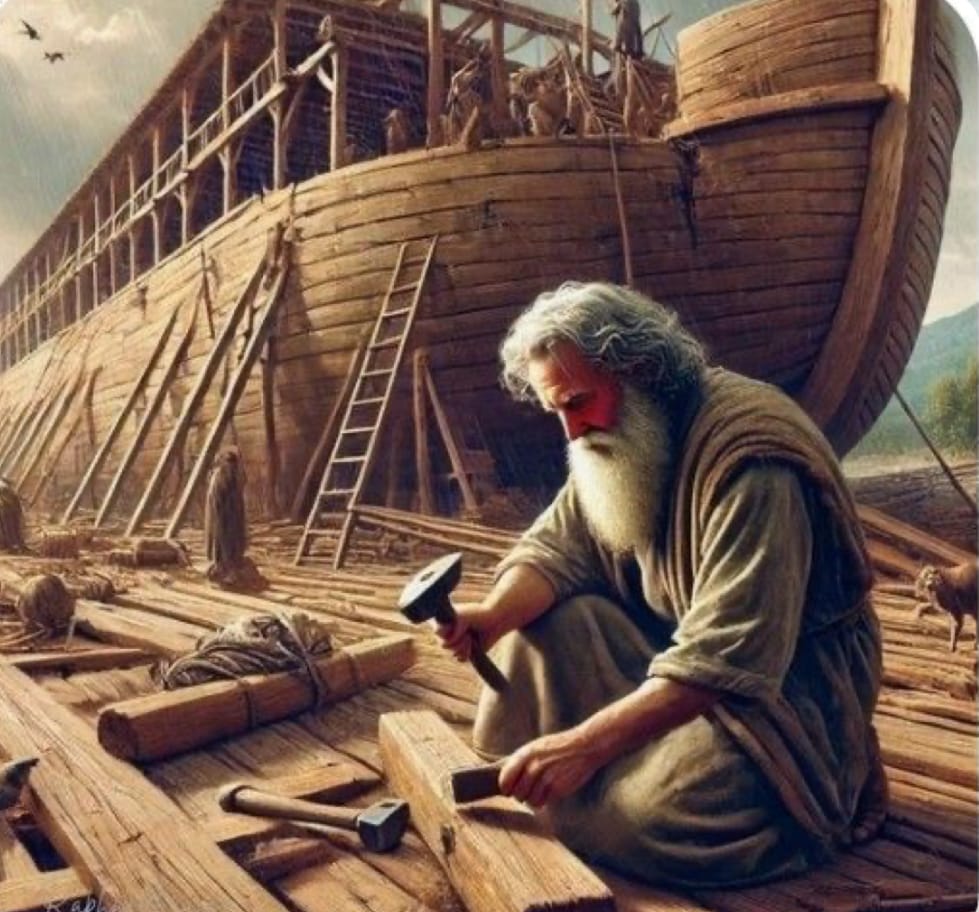 挪亞與他的三個兒子,閃、含、雅弗,按照上帝的指示興建方舟,他們日以繼夜不斷趕工。在建造過程中,挪亞不斷宣講上帝要審判世界,要大家停止惡行並要悔改。但大家不信,仍嘲笑挪亞興建方舟,大家仍在行惡當中,仍然是我行我素,不肯悔改。但挪亞不理會人們嘲笑,也不怕建造工作的辛苦勞累,他花了120年的時間建造,方舟終於建造成功。