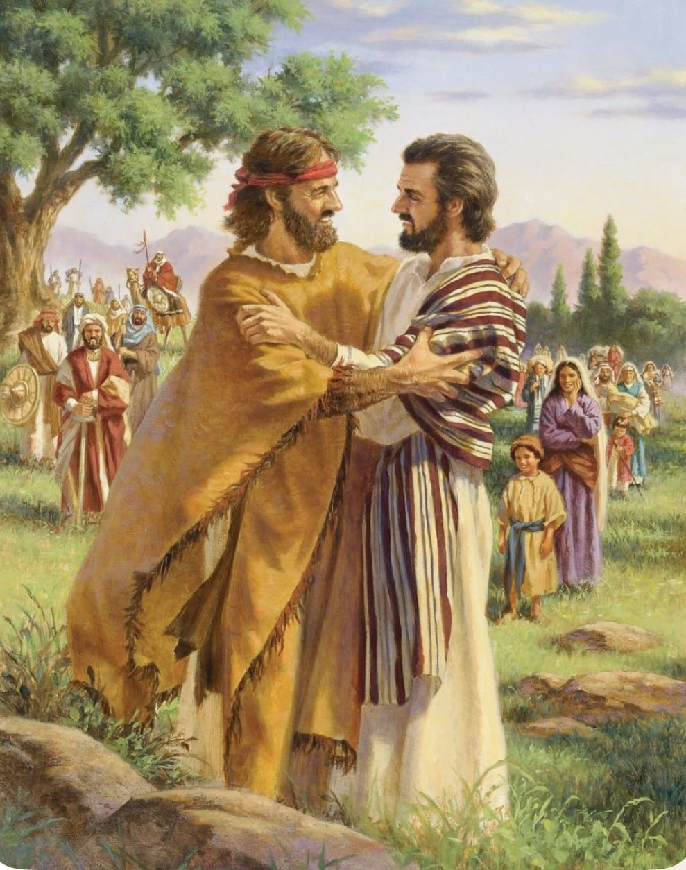 雅各過了河,與家人走在一起,雅各舉目觀看,看見以掃正帶著四百人向著這方向前來。雅各就把孩子分開交給利亞,拉結和兩個妾士。並且叫兩個妾士和她們的孩子在前頭,利亞和他的孩子在中間,拉結和約瑟走在最後。雅各走到最前頭,一連七次俯伏在地,朝著以掃叩頭。