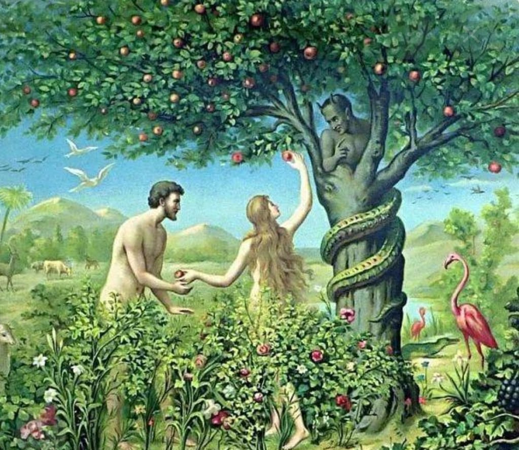 一天,「夏娃」在園中散步,蛇低聲對「夏娃」說:「上帝真的說過,你們不可以吃園中任何一棵樹上的果子嗎?」「夏娃」回答說:「我們可以吃園中樹上的果子,但只有園中那棵樹,上帝曾經說:「你們不可以吃那棵樹的果子,也不可以摸,否則你們便因此而死。」夏娃甚至把上帝沒有說過「也不可以摸」的話自已加添上去。
