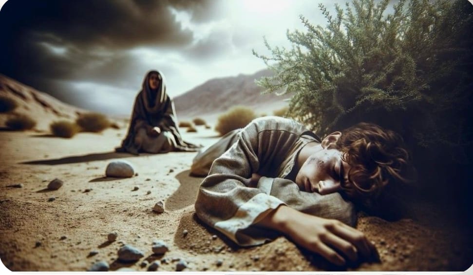 烈日當空,非常炎熱,兩人在曠野時,皮袋裏的水都喝光了。夏甲把兒子安放在小樹下,自己走開約有一箭之遠,他們相對而坐,夏甲感到前路茫茫,以後的生活如何是好?眼看見兒子就快因脱水而喝死,夏甲這刻控制不了放聲嚎哭說:「我不忍心見到孩子死。」孩子見到母親哭,自己也跟著哭。