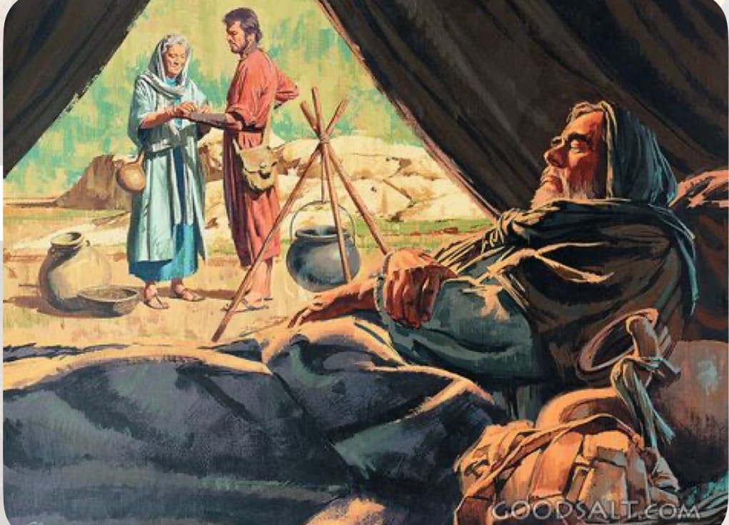 以撒為雅各祝福完後,雅各便從父親那裏出來。此時,他的哥哥以埽正打獵回來,也做成野味,拿到他父親面前說:「請父親起來,吃你兒子的野味,好為我祝福。」