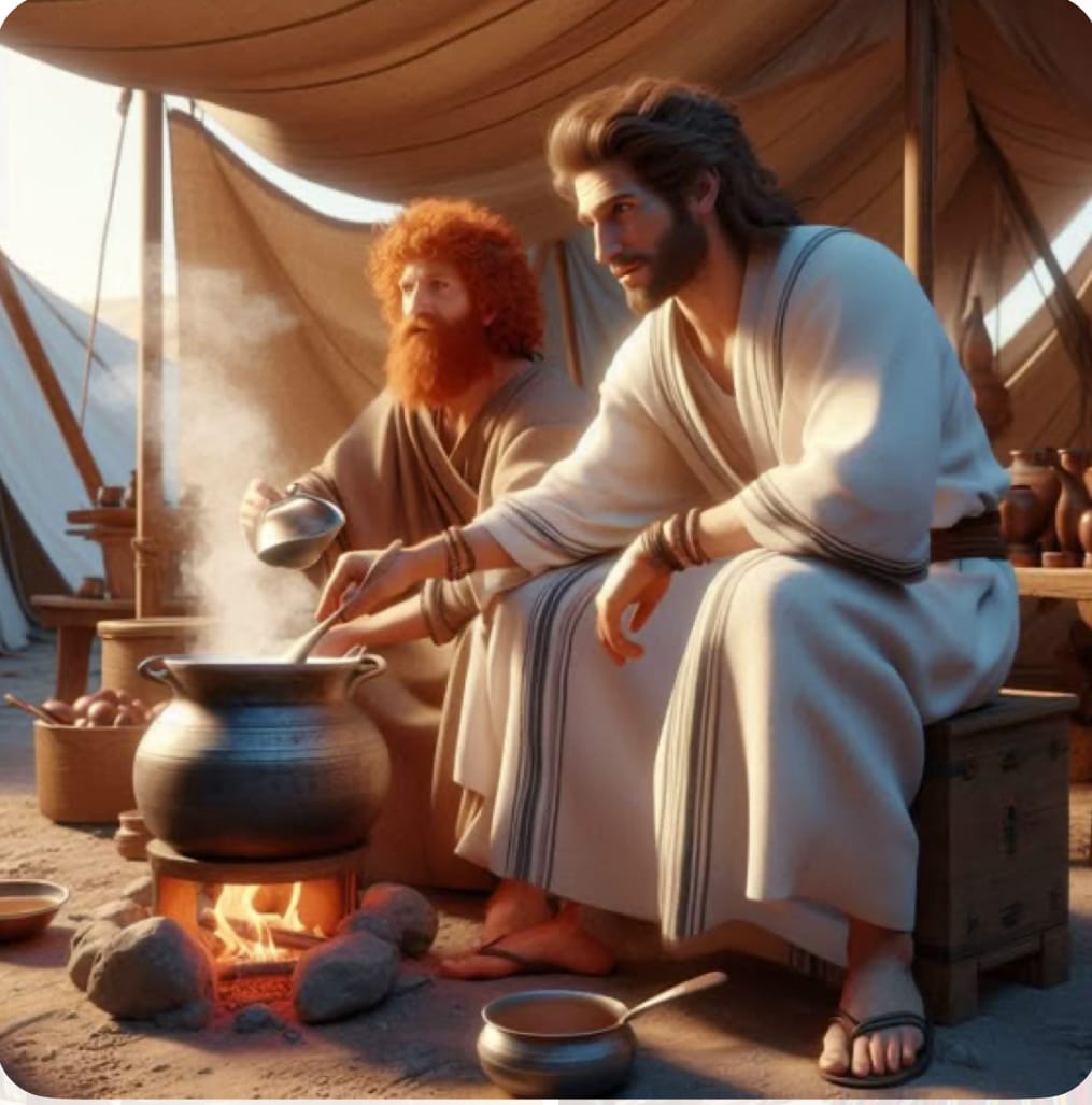有一天,雅各煮紅豆湯,又餓又累的哥哥以掃剛從田野打獵回來。